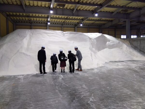 工場棟内(背景の白い山は「塩」です) 倉庫棟内